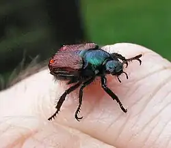 An. austriaca, хлебный жук, кузька, кузка, куська, краська, красун, или хрущик, — один из самых крупных видов этого рода, длиной 15 — 20 мм, темно-зеленого цвета с металлическим блеском. Надкрылья желтовато-красные, часто к наружным краям буро-красные. У большей части экземпляров (у самок почти всегда, у самцов реже) на надкрыльях около щитика находится большое 4-угольное черное пятно, у самцов боковой край надкрыльев простой, а у самок на боковых краях в передней части их находится довольно большое утолщение, имеющее вид валика. Голени задних ног значительно утолщены. Спинная сторона брюшка покрыта редкими, серыми волосками, а вся нижняя поверхность тела покрыта густо беловато-серыми волосками, прилегающими к хитиновому покрову.[8]
