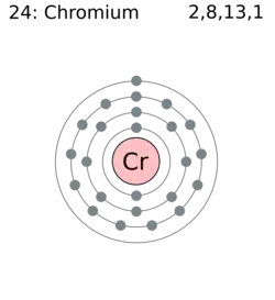 Хром (лат.Chromium; обозначается символом Cr) — элемент 6-й группы, четвёртого периода периодической системы (по устаревшей классификации — побочной подгруппы шестой группы, VI-B) с атомным номером 24. Как простое вещество хром в нормальных условиях представляет собой твёрдый переходный металл голубовато-белого цвета, не тускнеющий и не окисляющийся на воздухе. Хром иногда относят к чёрным металлам. Название «хром» произошло от греч.χρῶμα — цвет, краска — из-за разнообразия и яркости окраски химических соединений этого элемента.