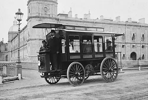 В 1899 году в Санкт-Петербурге русский дворянин и инженер-изобретатель Ипполит Романов создал первый русский электрический омнибус на 17 пассажиров. Его общая компоновка была заимствована у английских конных экипажей, где извозчик располагался на высоком сиденье позади пассажиров.[7] | |