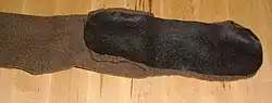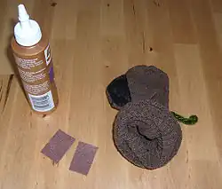 Basic material for the troll is a brown cotton men's sock. Exact measurement depends on the size of the puppeteer's hand. The end of the sock may project beyond the puppeteer's fingers, but the mouth itself should not curl with the puppeteer's hand. The cut for the mouth begins from the toe seam.