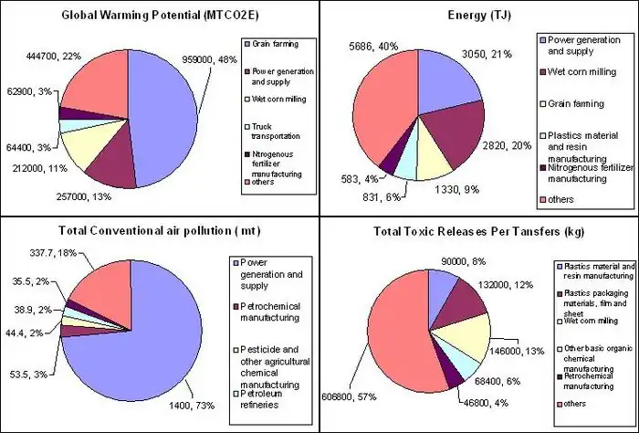 From the total energy consumption chart, it can be observed that wet corn milling also contributes to 20% of the overall energy usage. Similarly, its main sources of energy come from coal and natural gases. The burning and mining of these two energy sources both produces greenhouse gases and toxic residues which causes air pollutions and global warming.