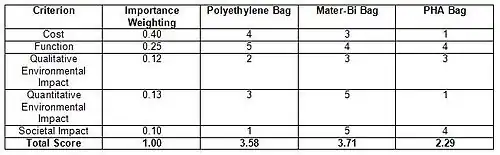 Based on this study and the work of others in this area of environmental analysis, it is clear that the Mater-Bi grocery bag is the best choice for the Canadian market and North American production. Its minimal impact to the environment and its positive impact on societal behaviour outweigh its slightly higher production costs, and therefore, can be considered superior to the lower-cost, environmentally unfriendly polyethylene, and the higher-cost, underdeveloped PHA.