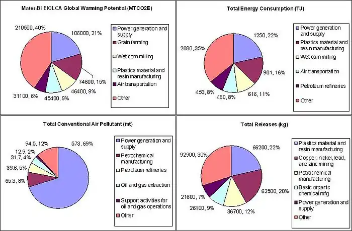 Sensitivity analysis of the results showed that a 25% increase in cornstarch content in Mater-Bi would lead to 8.1% increase in global warming potential and 5.2% increase in energy from agriculture activities. The true production cost was not released by Novamont and variation in estimated values is in direct relation to the environmental impact found using the EIOLCA.