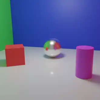 Notice how the shadow is completely black in the real-time lighting example below, which looks very artificial. This is because, in real life, the light hitting the walls and floor around the object would bounce around the room, bringing the colors of those objects with them[6]. These light bounces would end up hitting the shadowed area of this object, changing its color. Looking at the pre-rendered image, we see that the shadow is not black and has some color. Pre-rendered images often use a lighting method called path-tracing, which accurately bounces the rays of light coming from the light source.