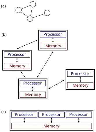 The figure on the right illustrates the difference between distributed and parallel systems. Figure (a) is a schematic view of a typical distributed system; the system is represented as a network topology in which each node is a computer and each line connecting the nodes is a communication link. Figure (b) shows the same distributed system in more detail: each computer has its own local memory, and information can be exchanged only by passing messages from one node to another by using the available communication links. Figure (c) shows a parallel system in which each processor has a direct access to a shared memory.