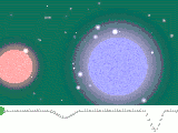 A binary star system consists of two stars that orbit around each other. Often, the two stars are too close together to see through a telescope. We can learn that a star is binary by watching the combined light from the two stars change in brightness. A graph of this change over time is called a light curve. In the diagram at left there is a large and a small star. The orbits are oriented so that periodically one star will pass in front of the other and block the light from the other star. The light curve beneath the animation shows the change in brightness of the combined light from the two stars.