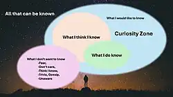 Our curiosity is limited only by our imagination and what we choose not to know. What we want to know can be as vast as the universe of all that can be know. However, there is information that we choose not to know for various reasons, including fear, apathy, certainty, trivia, unawareness, and other wise limits to our curiosity. The curiosity zone is further limited by what we do know and what we think we know (whether or not what we think we know is accurate). The gap then can be represented by a curiosity zone, shown here on the right.