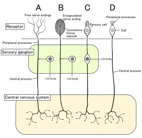 Most mechanoreceptors related to touch are constructed in such a way that mechanical stimulus will somehow alter the receptor and thereby allow firing of an action potential. For example, the cell labeled B in the adjacent diagram will have its capsule compressed whenever a sufficient level of pressure is applied. The physical force provided by this compression can alter the permeabilites of ion channels, thus setting off the action potential. While the cell in this example is adept at detecting changes in applied pressure, other receptors incorporate different mechanisms of activation, which accounts for why different stimuli activate each.