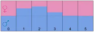 For positive arities, there are more males than females. The imbalance peaks for arity 2. For higher arities, the ratio is almost balanced.