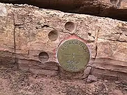 "In 2004, the Global Stratotype Section and Point (GSSP) for the terminal Proterozoic was placed near the base of the Nuccaleena Formation in Enorama Creek in the central Flinders Ranges [in the image on the right], thus establishing the Ediacaran System and Period (Knoll et al., 2006). As the Nuccaleena Formation has not been accurately dated, a date of c. 635 Ma from near-correlative levels in Namibia and China is presumed for the base of the Ediacaran (Hoffmann et al., 2004; Condon et al., 2005; Zhang et al., 2005)."[8]