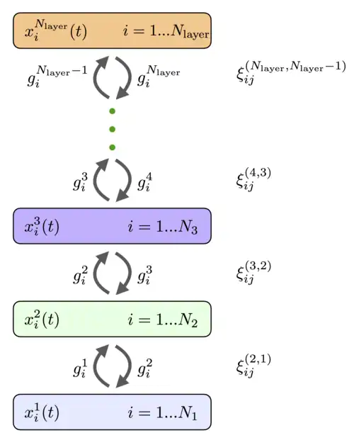 The neurons can be organized in layers so that every neuron in a given layer has the same activation function and the same dynamic time scale. If we assume that there are no horizontal connections between the neurons within the layer (lateral connections) and there are no skip-layer connections, the general fully connected network (11), (12) reduces to the architecture shown in Fig.4. It has layers of recurrently connected neurons with the states described by continuous variables and the activation functions , index enumerates the layers of the network, and index enumerates individual neurons in that layer. The activation functions can depend on the activities of all the neurons in the layer. Every layer can have a different number of neurons . These neurons are recurrently connected with the neurons in the preceding and the subsequent layers. The matrices of weights that connect neurons in layers and are denoted by (the order of the upper indices for weights is the same as the order of the lower indices, in the example above this means that the index enumerates neurons in the layer , and index enumerates neurons in the layer ). The feedforward weights and the feedback weights are equal. The dynamical equations for the neurons' states can be written as[26]