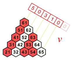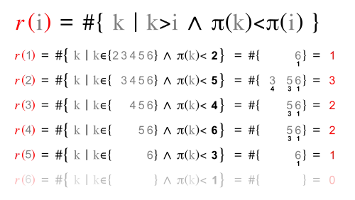 Inversion vector v and left inversion count l are shown next to each other, because they have the same digits.