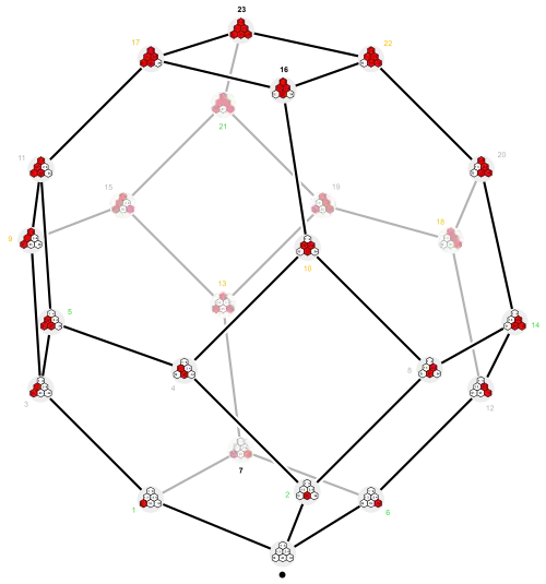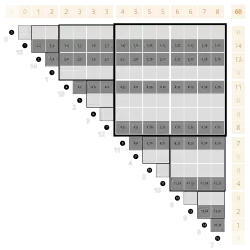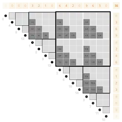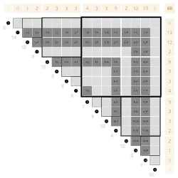 The default order of the table is the reverse colex order by , which is the same as the colex order by l. (This header cell is highlighted by a darker gray.)