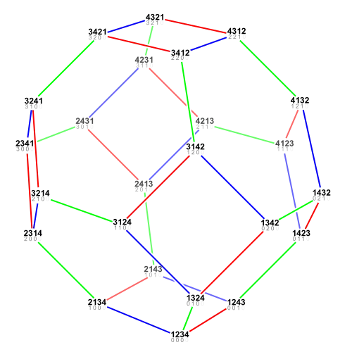 I: p1 = {2,5,4,6,3,1} I: p2 = {6,1,5,3,2,4} I: ToInversionVector[p1] O: {5,0,3,1,0} I: ToInversionVector[p2] O: {1,3,2,2,1} I: ToOrderedPairs[PermutationGraph[p1]] O: {{2,1},{3,1},{4,1},{5,1},{6,1},{4,3},{5,3},{6,3},{5,4},{1,2},{1,3},{1,4},{1,5},{1,6},{3,4},{3,5},{3,6},{4,5}} I: ToOrderedPairs[PermutationGraph[p2]] O: {{6,1},{3,2},{5,2},{6,2},{5,3},{6,3},{5,4},{6,4},{6,5},{1,6},{2,3},{2,5},{2,6},{3,5},{3,6},{4,5},{4,6},{5,6}}