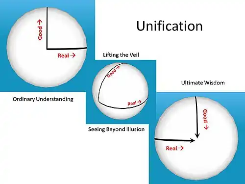 At our ordinary level of understanding we perceive a distinction between efforts to discover “what is real” and efforts to understand “what is good”. But perhaps this is an illusion, a result of our occluded view of how the world is based on the limitations of our current understanding. Perhaps eventually we can “lift the veil” and “see beyond this illusion” and recognize that when we fully understand what is real, when we have removed all veils and errors, it can only be good.