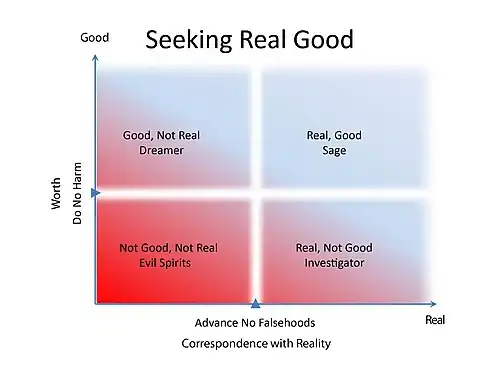 Wise students and instructors collaborate, using the real / good coordinate system to understand where their work is heading. By embracing the two parallel imperatives: “do no harm” and “advance no falsehoods” they guide themselves into the real, good region; they work in the realm of the sage.