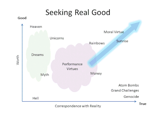 This dichotomy can be easily resolved if we consider how each activity represents good and correspondence to reality independently. Consider the area plotted below where “correspondence to reality” is represented on the horizontal axis, and “worth” is represented on the vertical axis. Genocide and other grand challenges are real, but not good. Utopia describes good, but is not real.