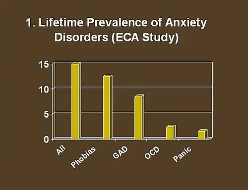 This chart shows the lifetime prevalence of anxiety disorders found in the Epidemiological Catchment Area Study. Data from: L. N. Robins and D. A. Regier, Eds. Psychiatric Disorders in America: The Epidemiologic Catchment Area Study. New York, NY: The Free Press.