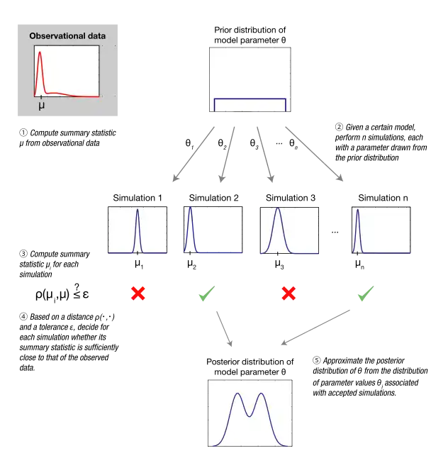 where the distance measure determines the level of discrepancy between and based on a given metric (e.g., the Euclidean distance). A strictly positive tolerance is usually necessary, since the probability that the simulation outcome coincides exactly with the data (event ) is negligible for all but trivial applications of ABC, which would in practice lead to rejection of nearly all sampled parameter points. The outcome of the ABC rejection algorithm is a sample of parameter values approximately distributed according to the desired posterior distribution, and, crucially, obtained without the need of explicitly evaluating the likelihood function (Figure 1).