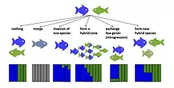There are several potential evolutionary outcomes of hybridization (Fig. 1). If early generation hybrids are not viable or sterile, hybridization may reduce the reproductive success of the parent species.[14][15] This could potentially lead to reinforcement, selection to strengthen premating isolation[16] or if the species fail to evolve premating isolation, it could increase their extinction risk due to wasted reproductive effort.[14] If the fitness of early generation hybrids is non-zero and that of some later generation hybrids is as high or even higher than the fitness of one or both parent taxa, hybrids may displace the parent taxa and the hybridizing taxa may fuse (speciation reversal[17][18]; Fig. 1). If the fitness of early generation hybrids is reduced but non-zero, hybrid zones may emerge in the contact zone of the taxa.[19] If hybrids are fertile, hybridization may contribute novel variation through rare hybrids backcrosssing with parental species. Such introgressive hybridization may enable neutral or selectively beneficial alleles to be transferred across species boundaries even in species pairs that remain distinct despite occasional gene flow.[20][21] Hybrid fitness may vary with divergence time between the hybridizing taxa. This pattern has been shown for a variety of taxa including Drosophila,[22] birds[23] and fish.[24] Hybrid fitness may also differ with cross direction,[25] between first generation and later generation hybrids,[26] and among individuals within generations of the same cross-type.[27][28] In some cases hybrids may evolve into new hybrid species with reproductive isolation to both parent taxa.[29][30] Below we describe the evolutionary outcomes of hybridisation that result in persistent hybrid genomes.