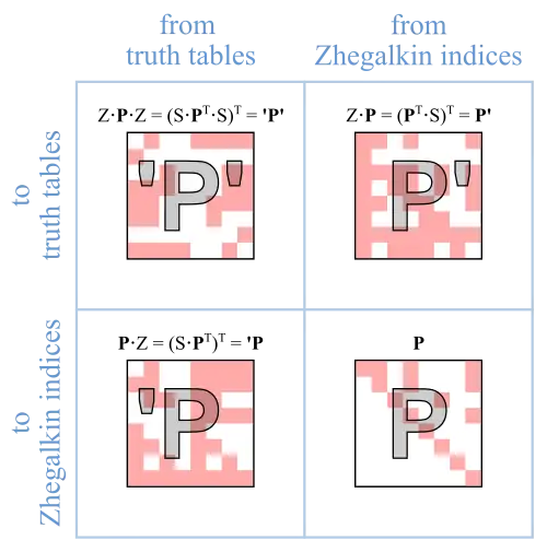 This is the soft permutation between twins, linking truth tables and Zhegalkin indices.