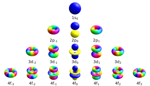 ![]() The first property describing the orbital is the w:principal quantum number, n, which is the same as in Bohr's model. n denotes the energy level of each orbital. The possible values for n are integers: The next quantum number, the w:azimuthal quantum number, denoted l, describes the shape of the orbital. The shape is a consequence of the w:angular momentum of the orbital. The angular momentum represents the resistance of a spinning object to speeding up or slowing down under the influence of external force. The azimuthal quantum number represents the orbital angular momentum of an electron around its nucleus. The possible values for l are integers from 0 to n − 1 (where n is the principal quantum number of the electron): The shape of each orbital is usually referred to by a letter, rather than by its azimuthal quantum number. The first shape (l=0) is denoted by the letter s (a w:mnemonic being "sphere"). The next shape is denoted by the letter p and has the form of a dumbbell. The other orbitals have more complicated shapes (see w:atomic orbital), and are denoted by the letters d, f, g, etc. The third quantum number, the w:magnetic quantum number, describes the w:magnetic moment of the electron, and is denoted by ml (or simply m). The possible values for ml are integers from −l to l (where l is the azimuthal quantum number of the electron): The magnetic quantum number measures the component of the angular momentum in a particular direction. The choice of direction is arbitrary, conventionally the z-direction is chosen. The fourth quantum number, the w:spin quantum number (pertaining to the "orientation" of the electron's spin) is denoted ms, with values +1⁄2 or −1⁄2. The chemist w:Linus Pauling wrote, by way of example: