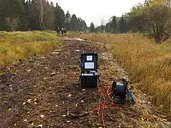 In the image at the right, geophysicists from the Department of Earth Science at Aarhus University perform electrical measurements (DC/IP) at Ulstrup in Denmark. Studerende fra Instituttet for Geologi ved Århus Universitet, der udfører geofysisk feltarbejde i Ulstrup nær Viborg.