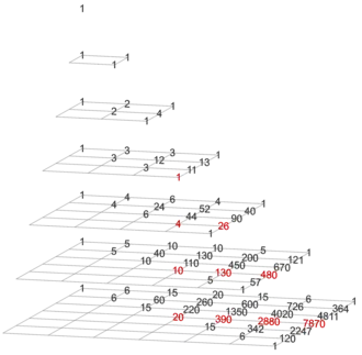 depth − gravity = 0 Pascal's triangle (with trivial column on the left)