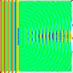 To understand why, put yourself reference frame of your flat sheet. The sheet is now at rest and an electron is moving towards it. By the de Broglie hypothesis, this electron will have wavelength (given by Eq. (3) to be h/mv). But if the electron acts as a wave, it will undergo single slit diffraction as shown in the figures to the left and right. Notice how decreasing the diameter of the hole increases the motion the spreading of the wave. The more you know about the position, the less you know about the motion, and vice versa. With a bit of basic algebra, the well-known equation for single slit diffraction can be shown to be consistent with the following inequality: