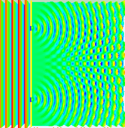 The image to the left illustrates a simple argument for a probabilistic interpretation. Although the wave shown is not a solution to Schrodinger's equation. Wavepackets can become delocalized, hear by impinging on some sort of barrier. What attribute of a particle can be in two places at the same time? Probability! To create this situation in a classroom, tape a wooden block to a stretched snaky spring and strike it.