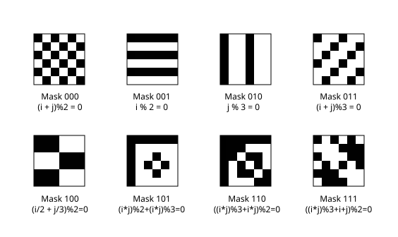 The next three bits of format information select the masking pattern to be used in the data area. The patterns are illustrated below, including the mathematical formula that tells whether a module is black (i and j are the row and column numbers, respectively, and start with 0 in the upper-left hand corner).