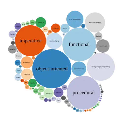 In addition to the programming languages themselves, Wikidata also describes programming paradigms. With the help of the script https://w.wiki/oLg and the illustration, you can see that by the number of programming languages, the most popular is object-oriented programming (399 languages for 2020), followed by procedural languages (297 languages for 2020). It is worth noting that multi-paradigm programming (programming with the simultaneous use of multiple paradigms) is also represented by a large number of programming languages.