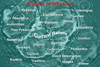 A belief is a state of mind in which you hold something to be true.[5] Beliefs may range from true to false, spanning various degrees of likelihood, doubt, indifference, or unawareness. True beliefs correspond to reality. We are influenced by many factors that ripple through our minds as our beliefs form, evolve, and may eventually change.