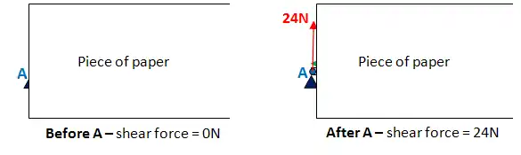 Now, let's do this for point B. BUT - slight complication - there's a force acting at point B, are you going to include it? The answer is both yes and no. You need to take 2 measurements. Firstly put your piece of paper, so it's JUST before point B: