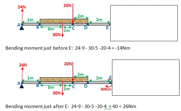 Just after: bending moment at C = 3·30 - 1·40 - 20 = 30Nm