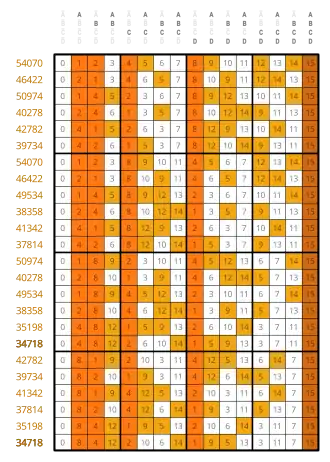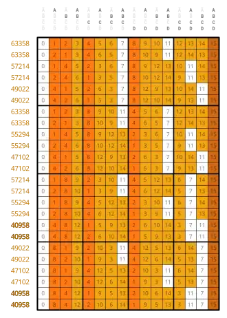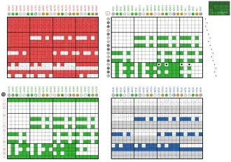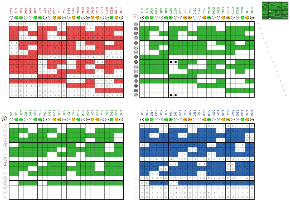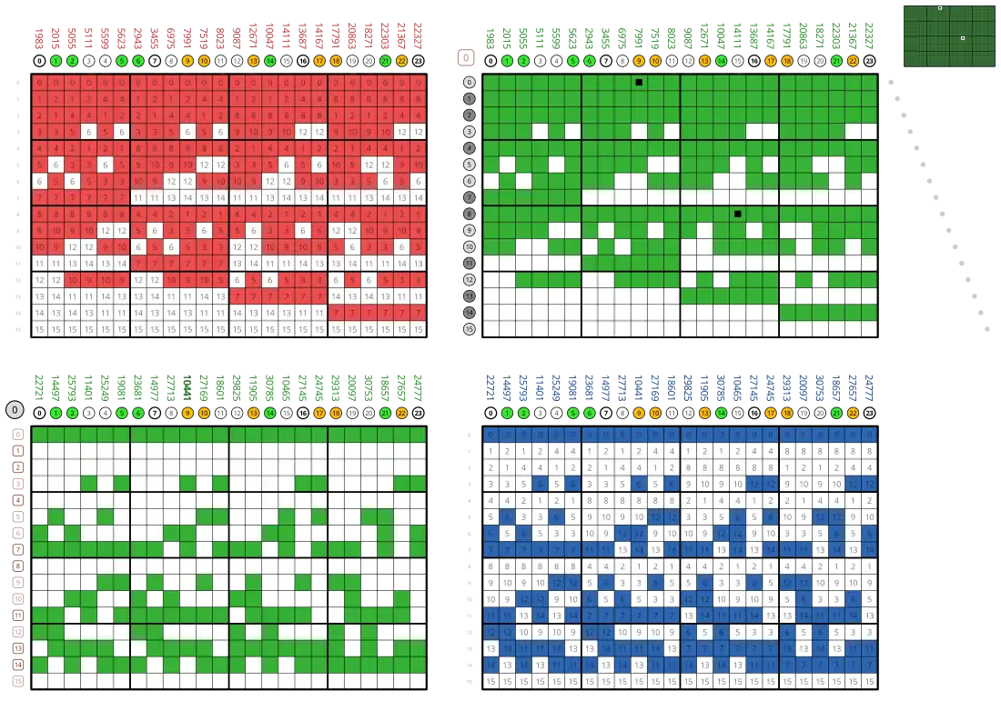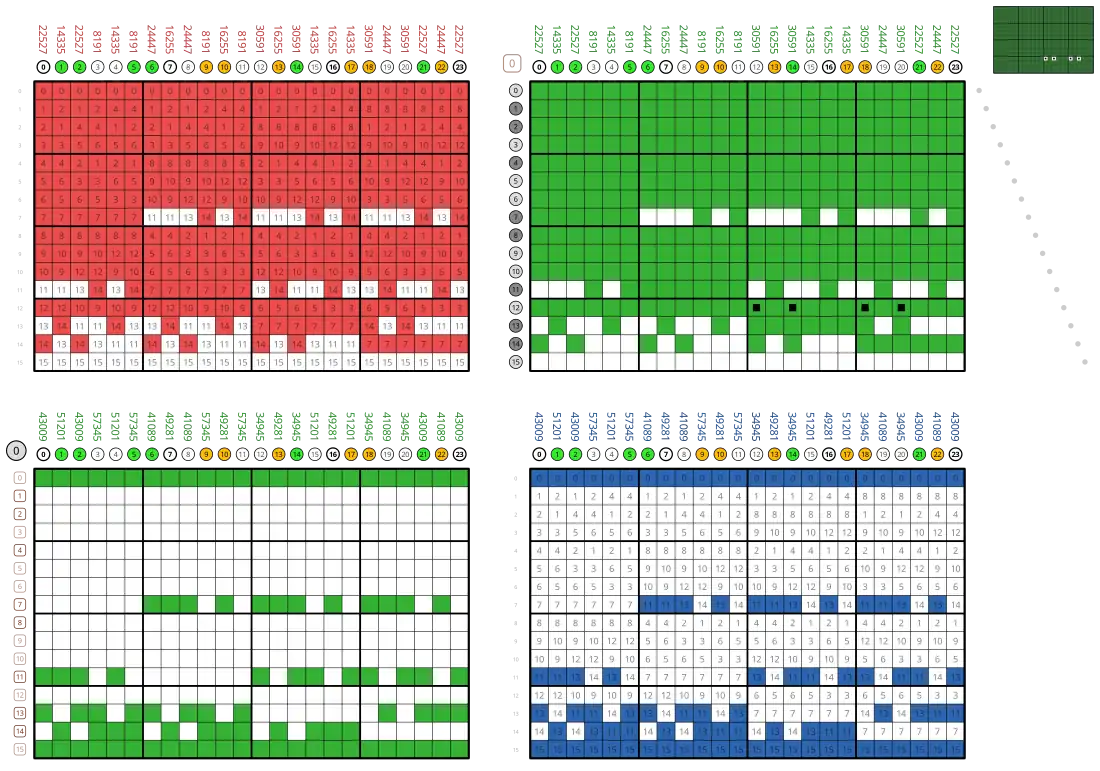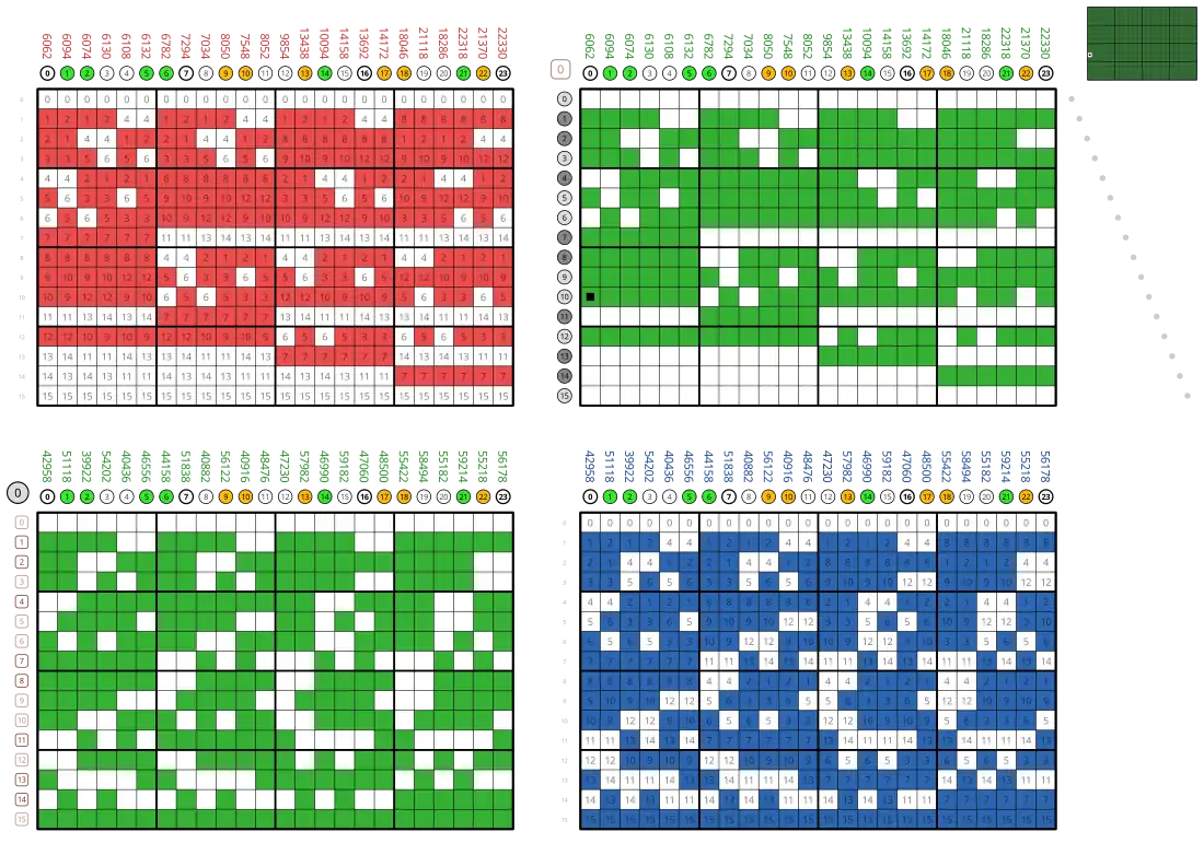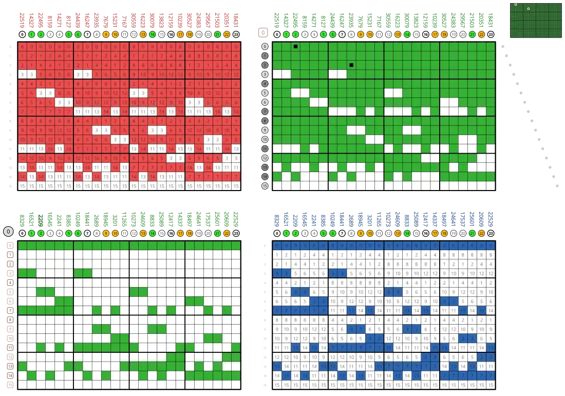 While the green matrix does not have an obvious pattern, that of its blue twin is very simple: