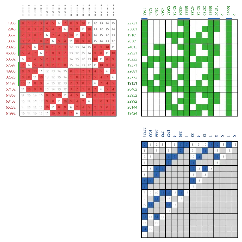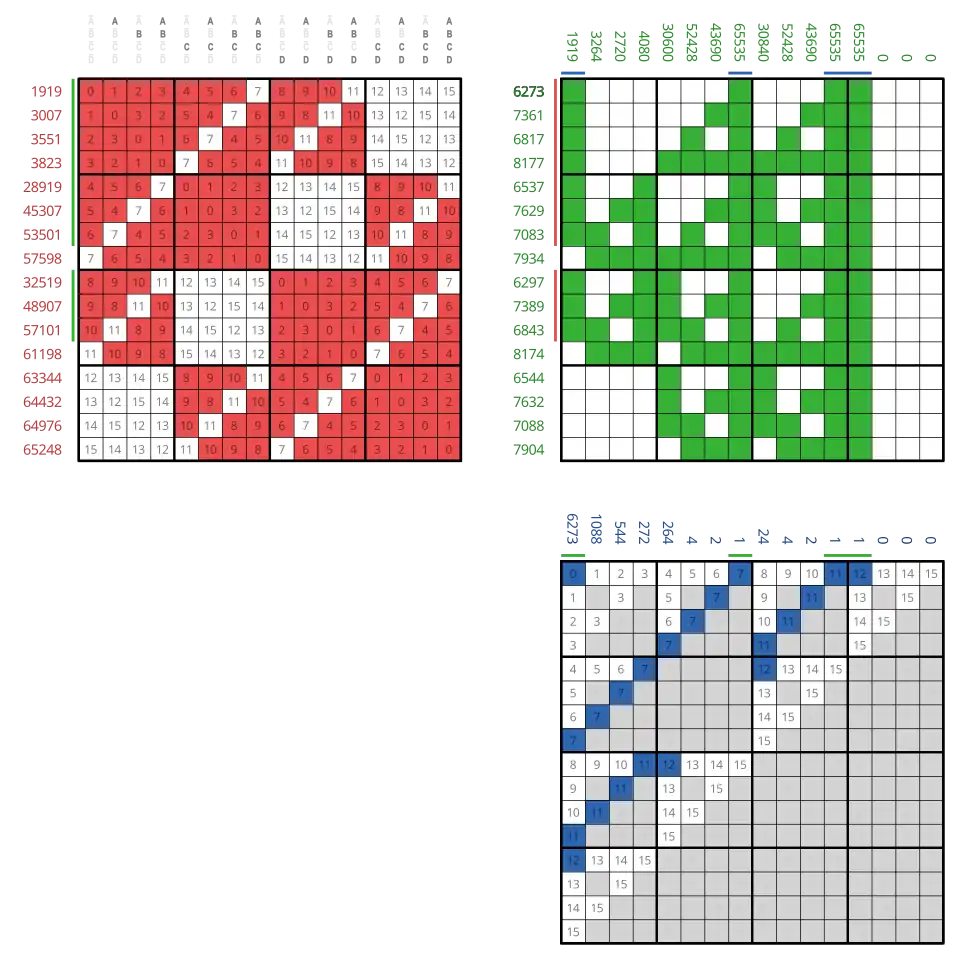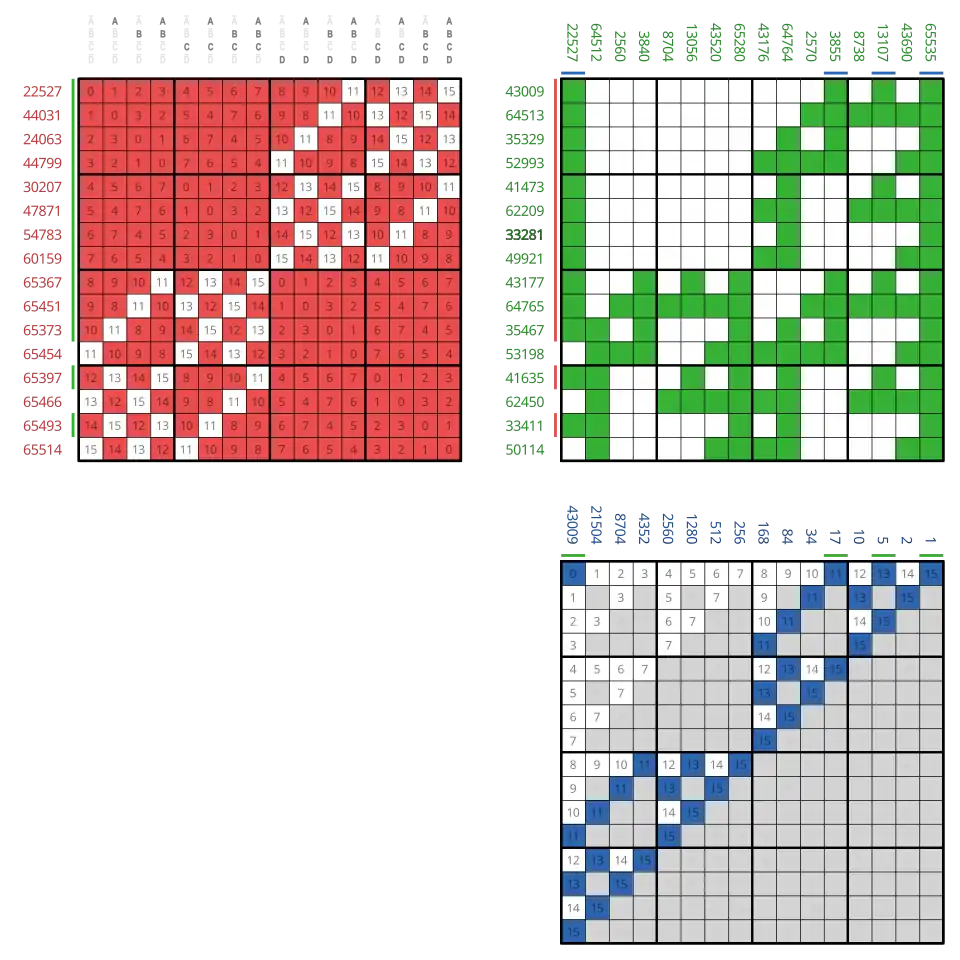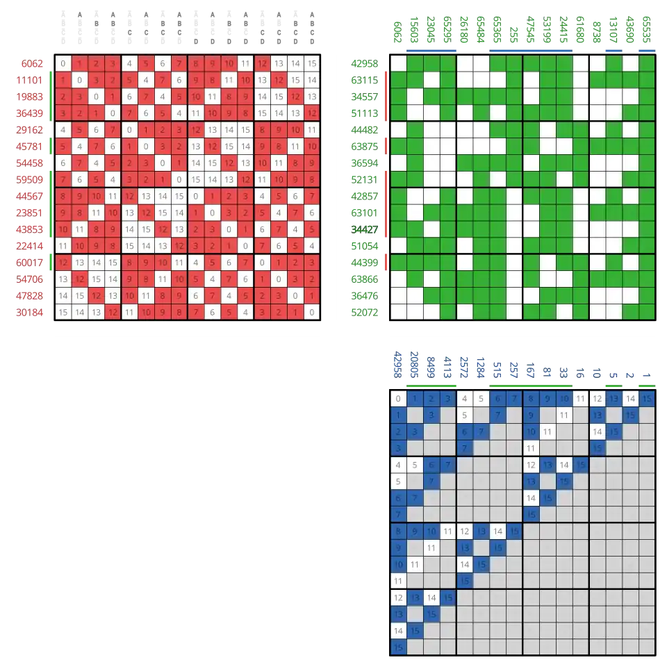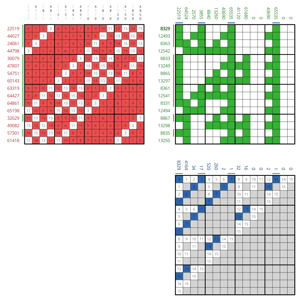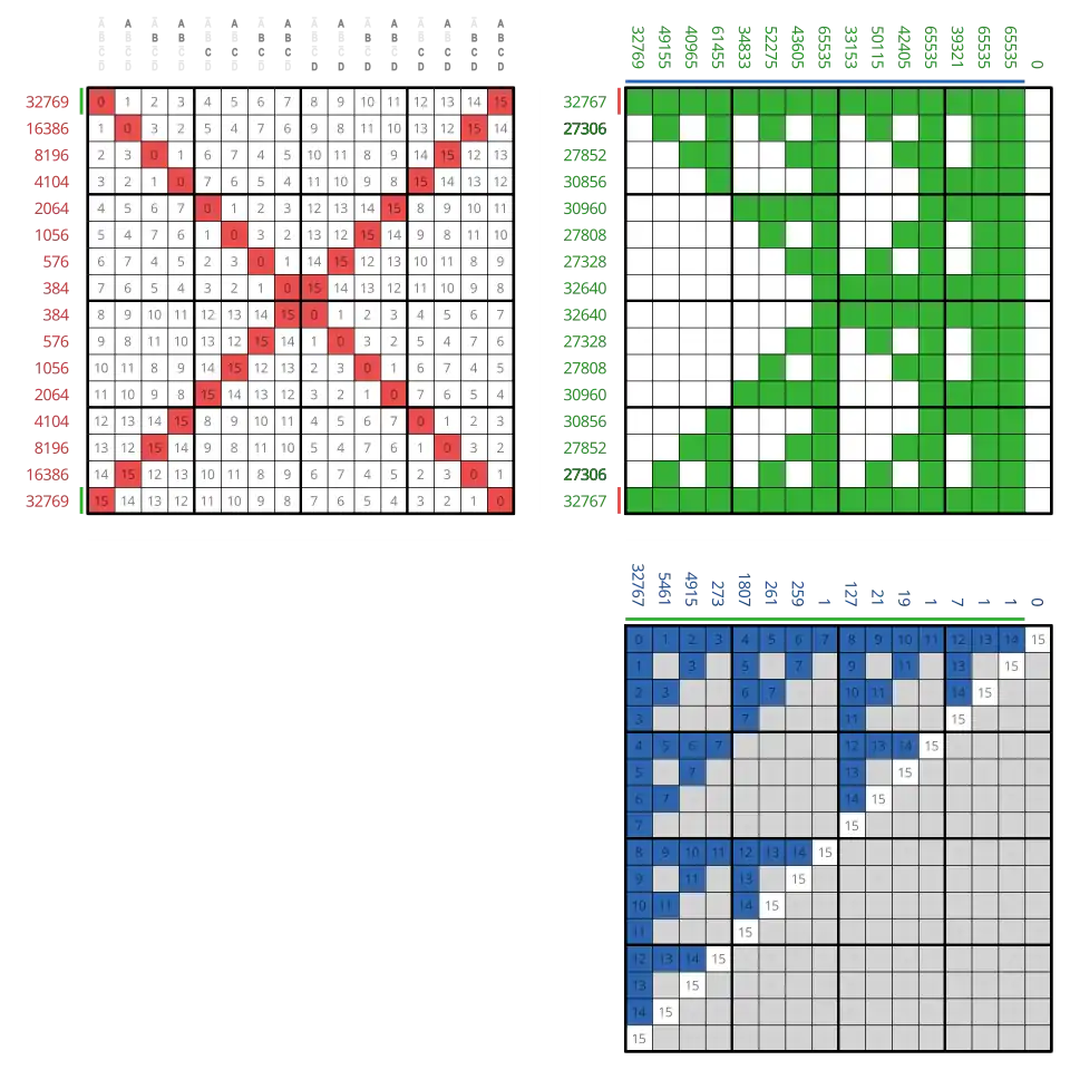 The rows of these 24×16 matrices are Boolean functions in the same faction. (Compare this matrix.)