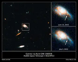 - ↑ 62.0 62.1 62.2 62.3 N. Tanvir; A. Fruchter; A. Levan (13 June 2013). "Hubble captures infrared glow of a kilonova blast". Baltimore, Maryland USA: Space Telescope. Retrieved 31 August 2019.