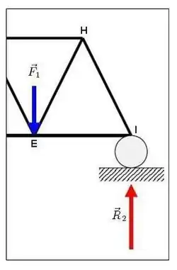 If the truss shown here were to need analysis for the internal forces on one particular member, EF, the method of sections could be used. Here we use the previous values for and . Also assume that each member is meters long.