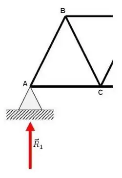 Secondly, we may begin to solve for the internal forces within each member by summing the forces around point A at the location of .