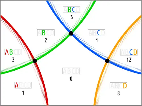The complement of dukeli is . The Venn diagram is easily recognized as a union of three lenses. | ||