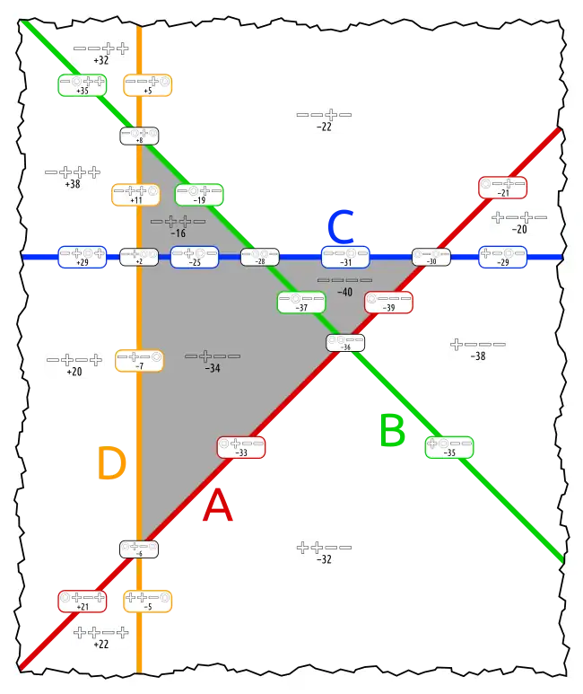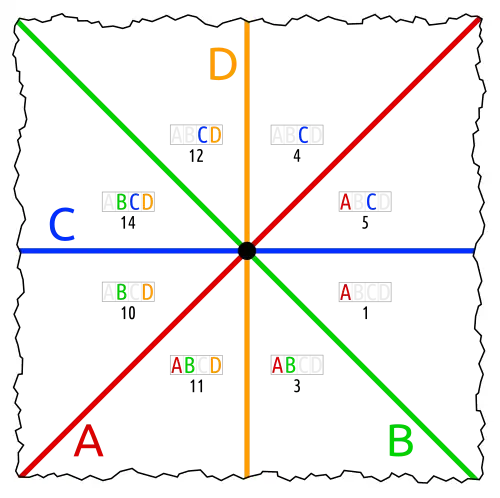In a 2-dimensional representation the borders intersect in a single point. (Compare foravo, the equivalent with 3 sets.)