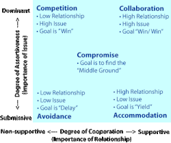 The diagram plots five styles along two axes.[1][2] The horizontal axis indicates the degree of cooperation; the importance of the relationship between yourself and the people holding or representing goals that contradict yours. The degree of cooperation can vary from non-supportive—where the relationship is not important, to supportive—where the relationship is considered valuable. The vertical axis indicates the degree of assertiveness; the importance of the issue. This ranges from submissive—the issue is not important, at the bottom, to dominant—the issue is important, at the top. These two dimensions are sometimes referred to as “need for affiliation” and “need for achievement” or as “getting along” and “getting ahead”. While these labels are linguistically clever, they may inaccurately suggest that the two dimensions are incompatible or conflict with each other.