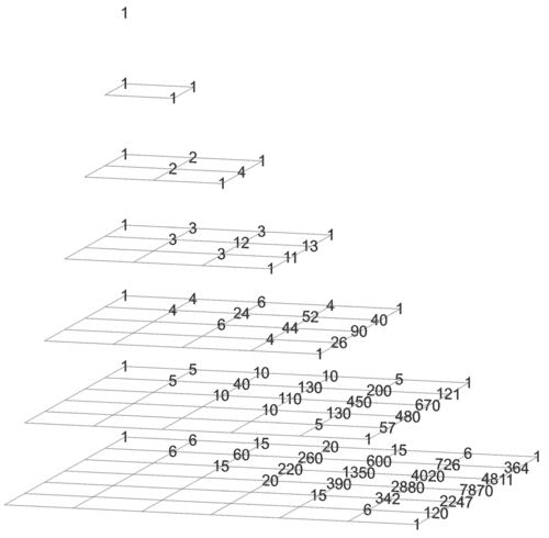 7   0 1 · 1 1 6 · 2 12 15 · 6 90 20 · 26 520 15 · 158 2370 6 · 1330 7980 1 · 15414 15414 26387