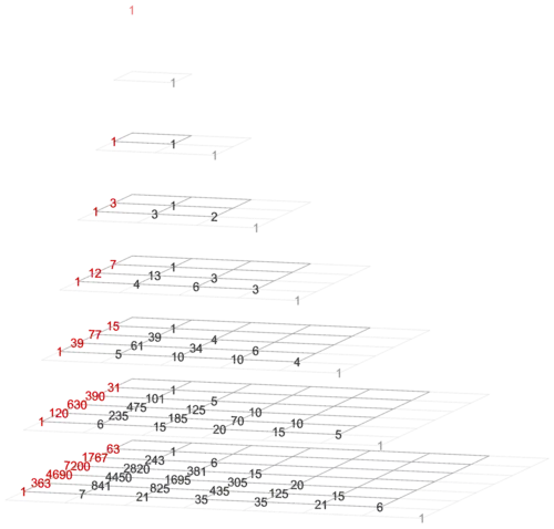- T(n,k) = (2^k-1) * T(n-1,k) + T(n-1,k-1)