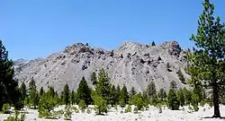 "Andesite and basaltic andesite lava flows erupted late in this period (Muddy River andesite) along with accompanying pyroclastic flow and lahar deposits of similar composition. Based upon analysis of exposed dacite domes found in the walls of the 1980 eruption crater, by the end of the Pine Creek Period the volcano was a cluster of lava domes that had grown to a maximum elevation of about 2,100 m (7,000 ft)."[12]