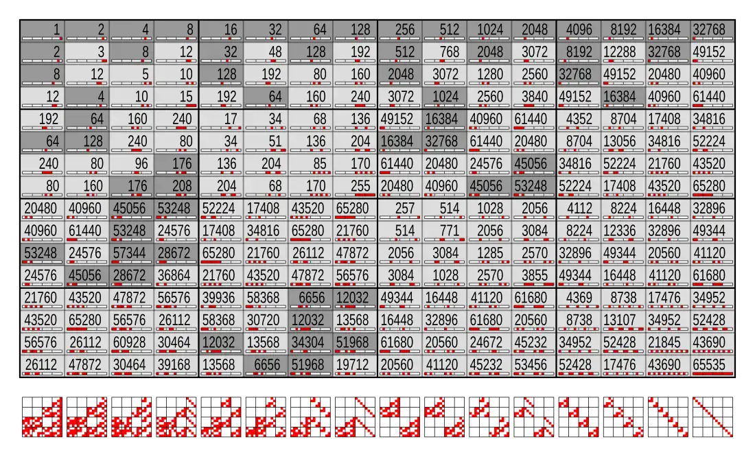 Further it can be seen that the nim-products of 2-powers are related to the compression vectors on the right.
