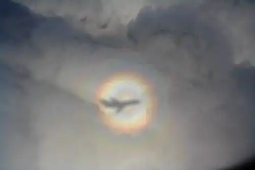 Interactions between light waves and water droplets also lead to the glory phenomenon, two examples of which can be seen below. The effect is that of a halo around the shadow of an object such as an aeroplane or a human head.