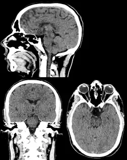 CT scan remains the cornerstone imaging modality for the initial evaluation and subsequent management of patients with acute traumatic brain injury due to its rapid acquisition time and high sensitivity for detecting hemorrhagic complications, such as intraparenchymal hematomas and subdural hemorrhages.[56] CT scan of the head is typically used to detect infarction (stroke), tumors, calcifications, haemorrhage.[57] Tumors can be detected by the swelling and anatomical distortion they cause, or by surrounding edema. CT scanning of the head is also used in CT-guided stereotactic surgery and radiosurgery for treatment of intracranial tumors, arteriovenous malformations, and other surgically treatable conditions using a device known as the N-localizer.[58][59][60][61][62][63]