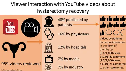 Objective: We aim to evaluate hysterectomy-recovery related videos on YouTube. [...] Methods: This cross-sectional study analyzed videos available through the YouTube interface. We calculated the views-per-day and interactions (comments, “thumbs up or down”) per 1,000 views for relevant videos. The publishers were categorized into patients, physicians, hospitals, media, industry, nonprofit, government and “other”. Video characteristics were compared between these categories using non-parametric tests. Results: We analyzed 2,092 YouTube videos related to hysterectomy recovery; 959 relevant videos published from August 30, 2006 to June 16, 2017 were included. The largest number of relevant videos were published by patients (48.6%), followed by physicians (15.8%), hospitals (12.7%), media (7.8%), and industry (7.6%). Views per day were similar between videos published by patients and physicians (median 2.1, vs median 2.6, p = 0.31). Videos published by patients had more interaction in the form of “thumbs up” votes (median 8.6/1,000 views, p<0.01) and comments (median 2.7/1,000 views, p<0.01) as compared to other categories. Conclusion: Almost half of the hysterectomy videos on YouTube are posted by patients and have more viewer interaction than other categories. Physicians should consider partnering with patient advocates to improve viewer interaction. doi: 10.15347/WJM/2020.006